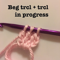 Beg trcl- ch 3, yo twice, insert hook into stitch indicated, pull up loop, *yo, pull through 2 loops. Repeat from* twice more. Beg trcl completed.